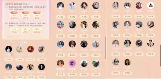 每位活动参与用户每天可以领到3票,投给38位“精选里的她们”。票数领先的创作者,抖音精选会以作者的个人名义,向女性公益项目捐出善款。